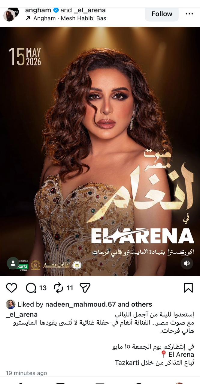 كما تستعد الفنانة المصرية أنغام لمفاجأة جمهورها في أبوظبي بحفل غنائي ضمن جولتها الفنية الحالية، حيث أعلنت الشركة المنظمة بدء طرح التذاكر وحثّت محبيها على حجز مقاعدهم قبل نفادها.