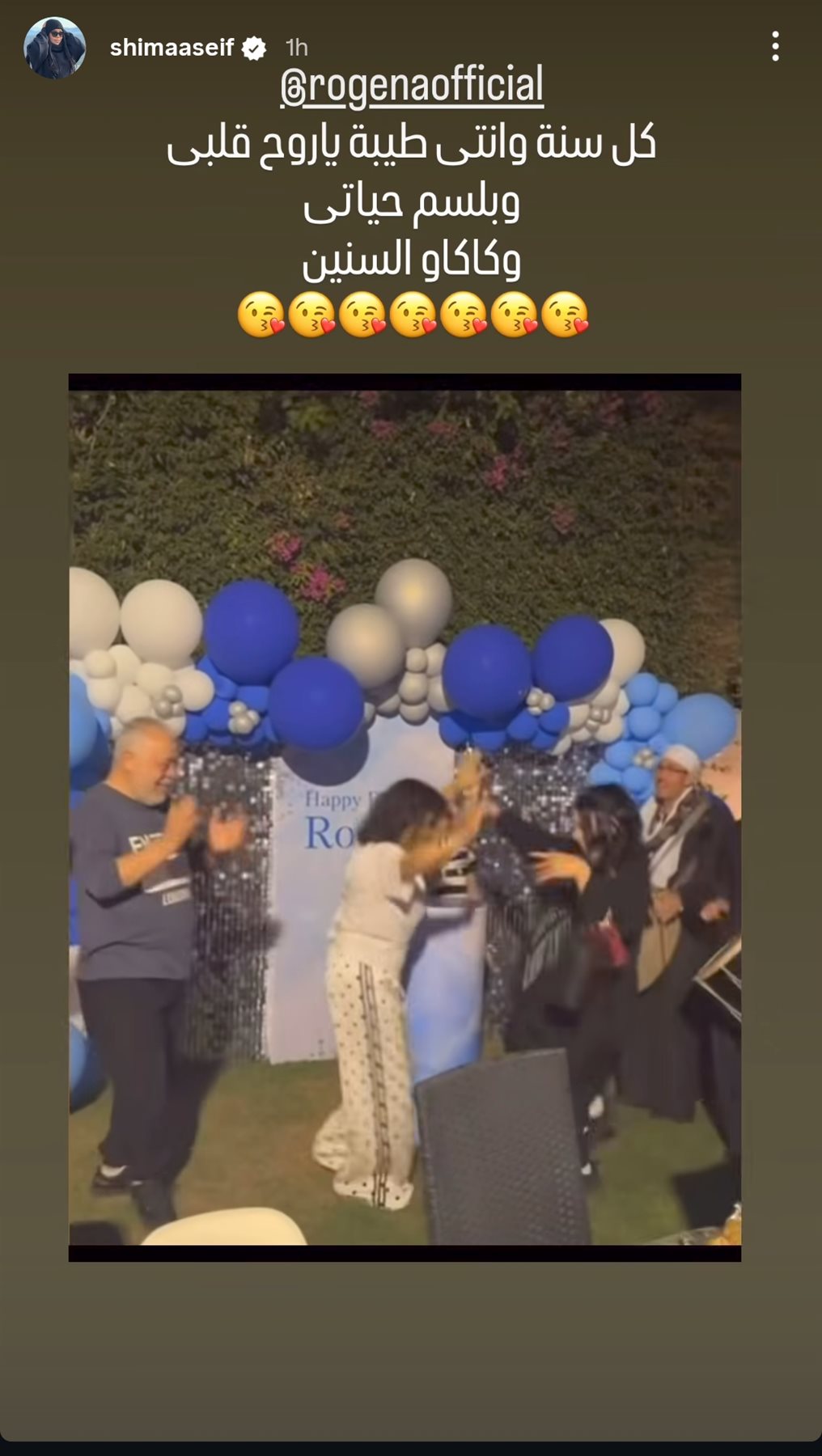 وفاجأت شيماء سيف روجينا، حيث احتفلت بعيد ميلادها بالطبل والمزمار، بحضور زوجها الفنان أشرف زكي، كما حرصت على تهنئتها، وكتبت من خلال حسابها الرسمي عبر موقع تبادل الصور والفيديوهات القصيرة إنستجرام، عبر خاصية ستوري، قالت: كل سنة وانتي طيبة يا روح قلبي وبلسم حياتي وكاكاو السنين.