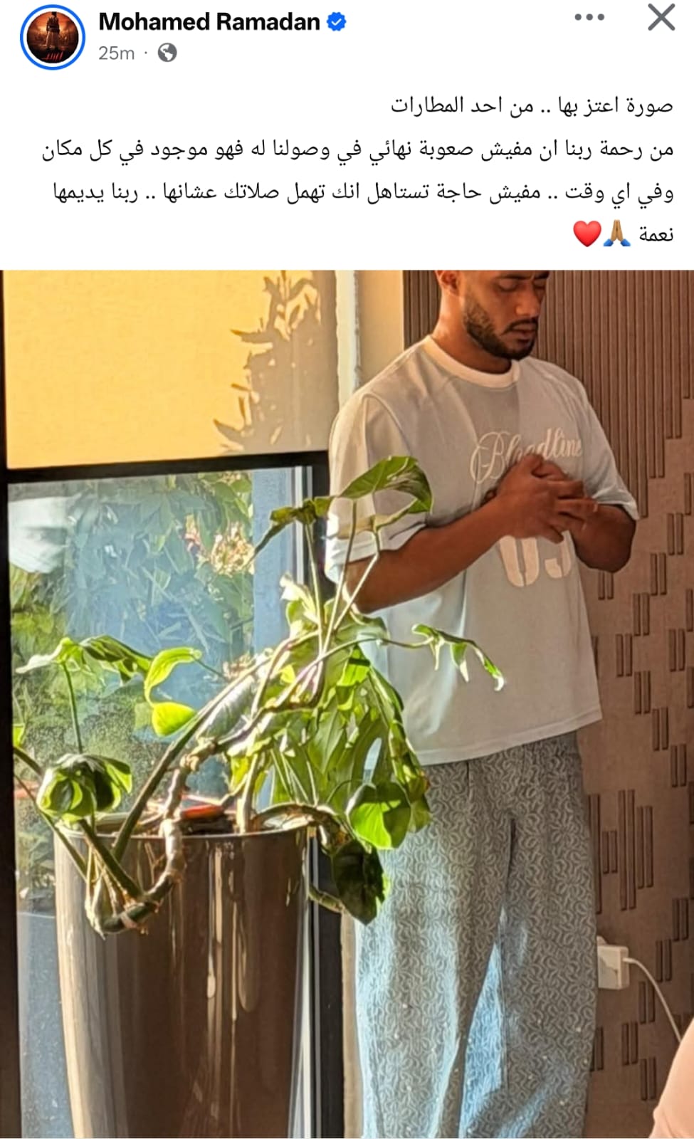نشر الفنان محمد رمضان صورة جديدة عبر حساباته الرسمية على مواقع التواصل الاجتماعي، ظهر خلالها أثناء أدائه الصلاة داخل أحد المطارات، وهو ما لاقى تفاعلاً كبيراً بين جمهوره.