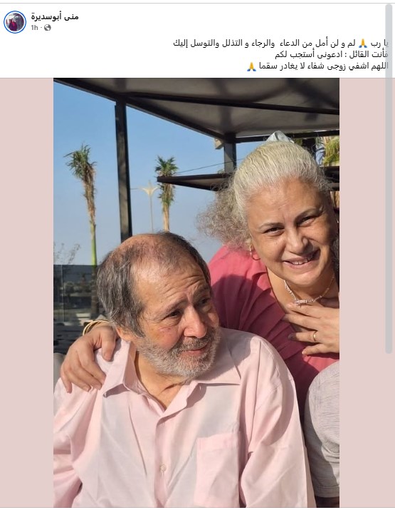 طالبت الفنانة منى أبو سديرة زوجة الفنان القدير سامي عبد الحليم بالدعاء له، وذلك بعد تدهو حالته الصحية في الفترة الأخيرة.