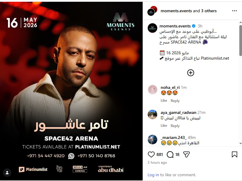 وشارك تامر عاشور جمهوره بوستر الحفل، من خلال حسابه الرسمي عبر موقع تبادل الصور والفيديوهات القصيرة إنستجرام، وعلق: أبوظبي على موعد مع الإحساس.. ليلة استثنائية مع الفنان تامر عاشور على مسرح SPACE42 AREN 16 مايو 2026.
