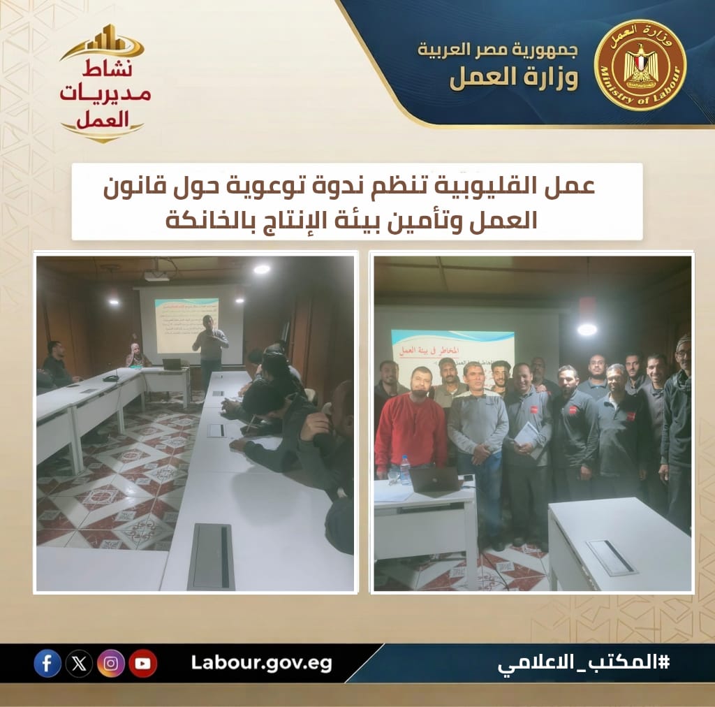 تنفيذًا لتوجيهات وزير العمل حسن رداد، نظمت مديرية عمل القليوبية، بقيادة فوزي صابر مدير المديرية، ندوة تثقيفية حول القانون رقم 14 لسنة 2025 ومعايير السلامة المهنية. وتناولت الندوة آليات تقييم المخاطر الهندسية والكيميائية لضمان بيئة عمل آمنة ومستقرة تدعم عجلة الإنتاج وتحمي حقوق طرفي العمل.