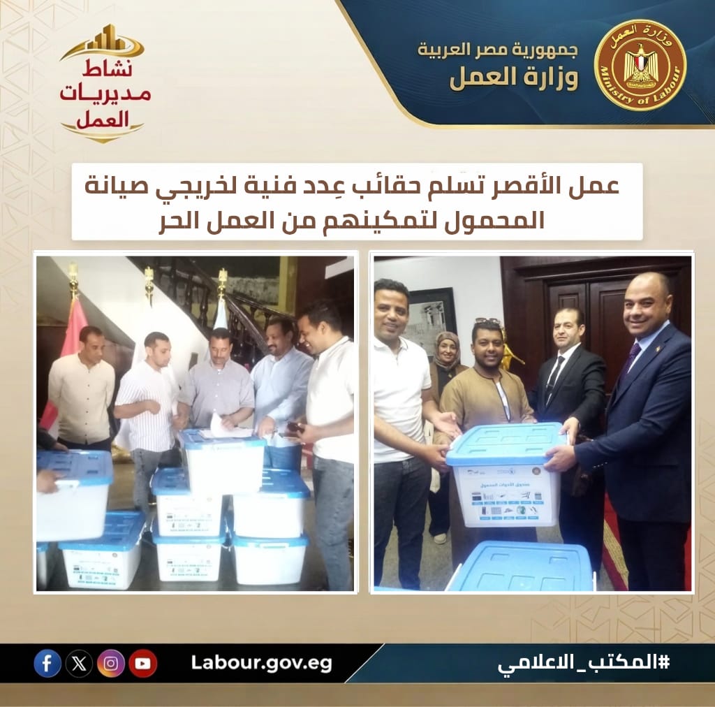 تنفيذًا لتوجيهات وزير العمل حسن رداد، سلم محمود باسل، مدير مديرية عمل الأقصر، حقائب معدات متكاملة لـ 11 شاباً من متميزي دورة صيانة المحمول. ويهدف هذا الإجراء لدعم التمكين الاقتصادي للشباب وتحويلهم إلى أصحاب مشروعات صغيرة ومنتجة لنشر ثقافة العمل الحر بالمحافظة.