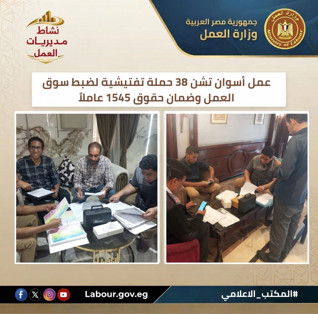 12. تنفيذ 38 حملة تفتيشية لضمان حقوق 1545 عاملاً بالمنشآت السياحية بأسوان