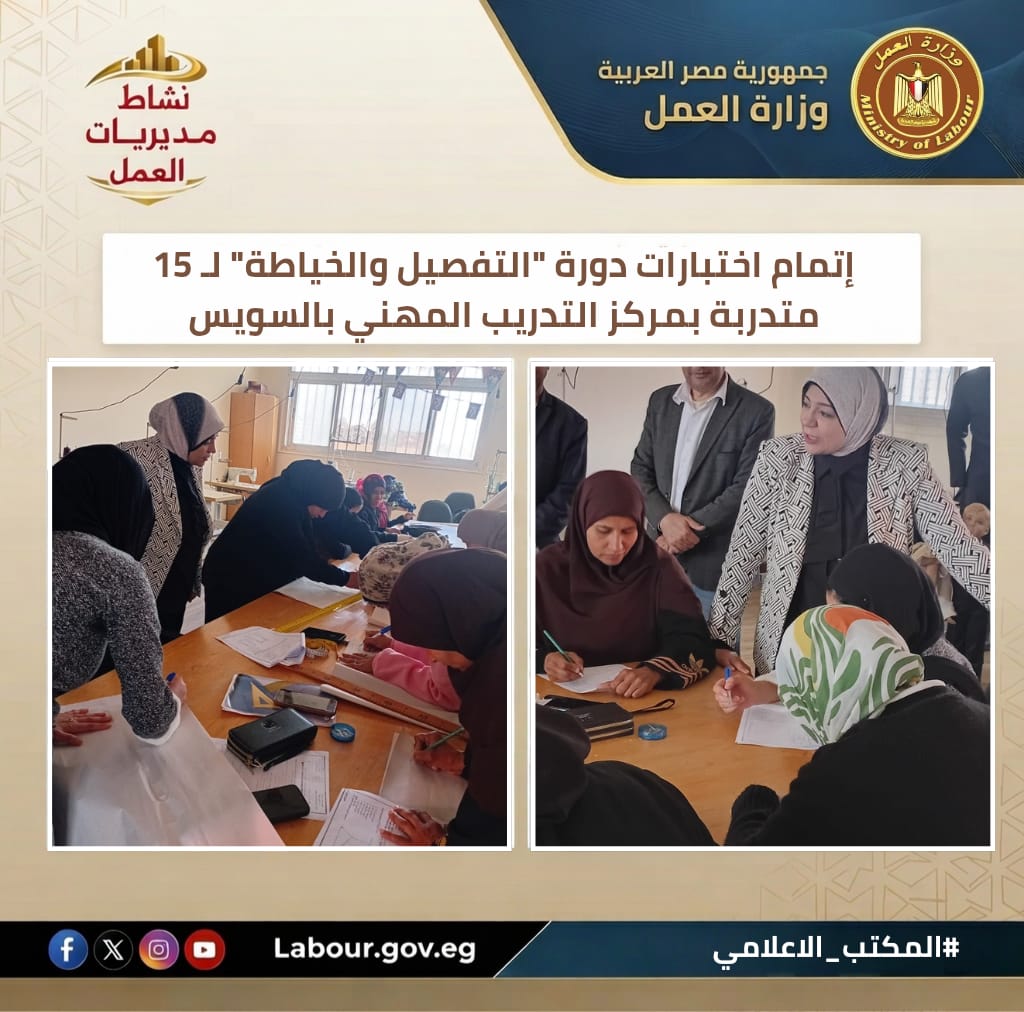 تنفيذًا لتوجيهات وزير العمل حسن رداد، وبإشراف لمياء محمود، مدير مديرية عمل السويس، اختتم مركز التدريب المهني بالتوفيقية الاختبارات لـ 15 متدربة. وتستهدف الدورة تأهيل المرأة المعيلة واكتسابها مهارات حرفية تمكنها من بدء مشروعها الخاص، تماشياً مع خطة الوزارة لتطوير منظومة التدريب.