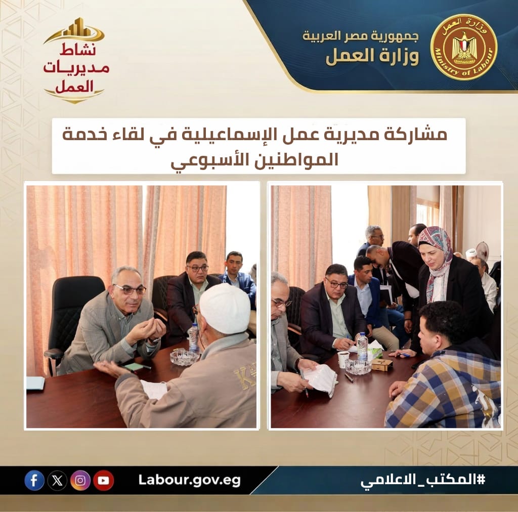 تنفيذًا لتوجيهات وزير العمل حسن رداد، شاركت مديرية عمل الإسماعيلية بقيادة الدكتور أيمن شعبان مدير المديرية،، في اللقاء الأسبوعي لخدمة المواطنين. وتستهدف المشاركة تعزيز التواصل المباشر مع الشباب وتوفير فرص عمل لائقة بالقطاع الخاص، خاصة لذوي الهمم، مع تقديم برامج تدريب مهني متطورة لتمكينهم اقتصادياً.