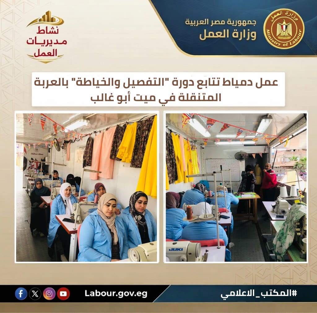 تنفيذًا لتوجيهات وزير العمل حسن رداد، تابعت مديرية عمل دمياط، بقيادة فتحي التلاوي مدير المديرية، تدريب 10 سيدات على مهنة التفصيل والخياطة بالوحدة المتنقلة. وتستهدف الدورة تمكين المرأة اقتصادياً بالقرى الأكثر احتياجاً، وصقل مهاراتهن الفنية بما يواكب متطلبات سوق العمل ويدعم إقامة مشروعات صغيرة.