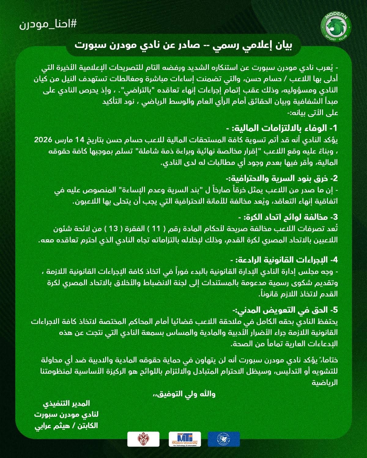 أصدر نادي مودرن سبورت بيانًا رسميًا أعرب فيه عن استنكاره الشديد للتصريحات التي أدلى بها اللاعب حسام حسن، مؤكدًا أنها تضمنت إساءات ومعلومات غير دقيقة تمس كيان النادي ومسؤوليه، وذلك عقب إنهاء التعاقد بين الطرفين بالتراضي