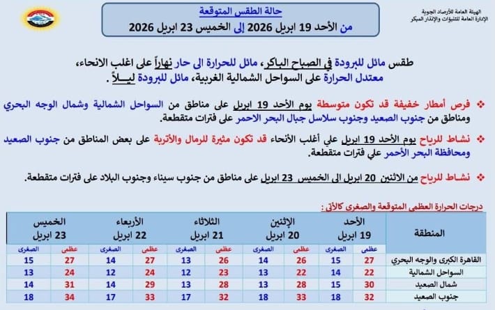 كشفت الهيئة العامة للأرصاد الجوية، عن توقعات حالة الطقس، اليوم الأحد 19 أبريل 2026 ، مشيرة إلى أن الأجواء ستكون مائلة للبرودة في الصباح الباكر وليلًا، بينما تسود أجواء مائلة للحرارة إلى حارة خلال ساعات النهار على أغلب الأنحاء.