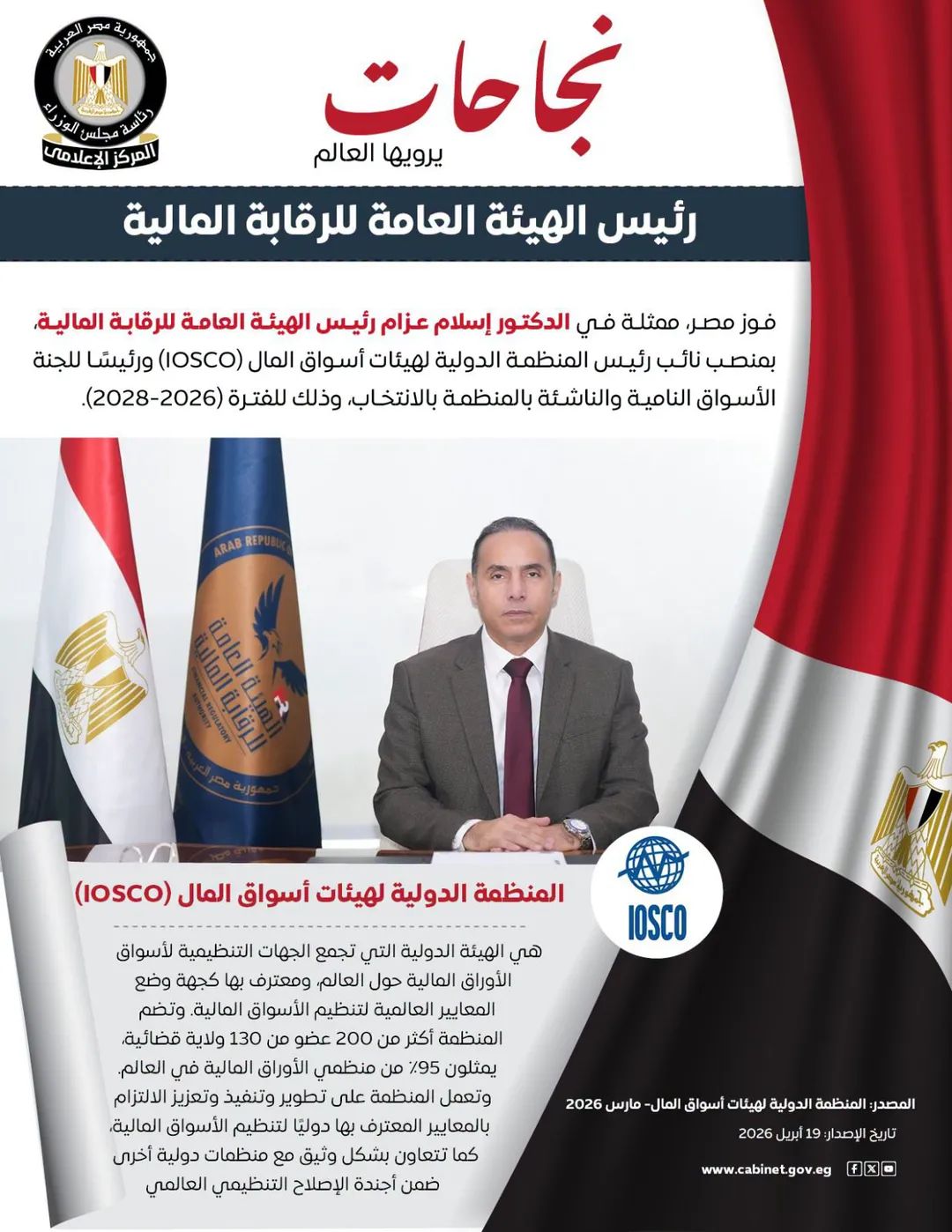 إنجاز دولي جديد يعكس قوة الحضور المصري في المؤسسات المالية العالمية، حيث فازت مصر ممثلة في الدكتور إسلام عزام رئيس الهيئة العامة للرقابة المالية بمنصب نائب رئيس المنظمة الدولية لهيئات أسواق المال، إلى جانب رئاسته لجنة الأسواق النامية والناشئة، وذلك عبر الانتخاب.