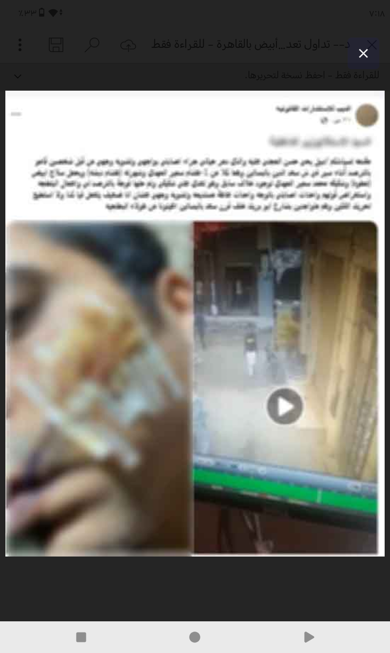 وبالفحص أمكن تحديد الشاكى (مالك ورشة - مقيم بدائرة قسم شرطة المعادى "مصاب بجرح قطعى")، وبسؤاله أفاد بتضرره من (سائق - مقيم بدائرة قسم شرطة البساتين) لقيامه بالتعدى عليه بالضرب بإستخدام سلاح أبيض وإحداث إصابته بسبب خلاف حول بيع هاتف محمول.