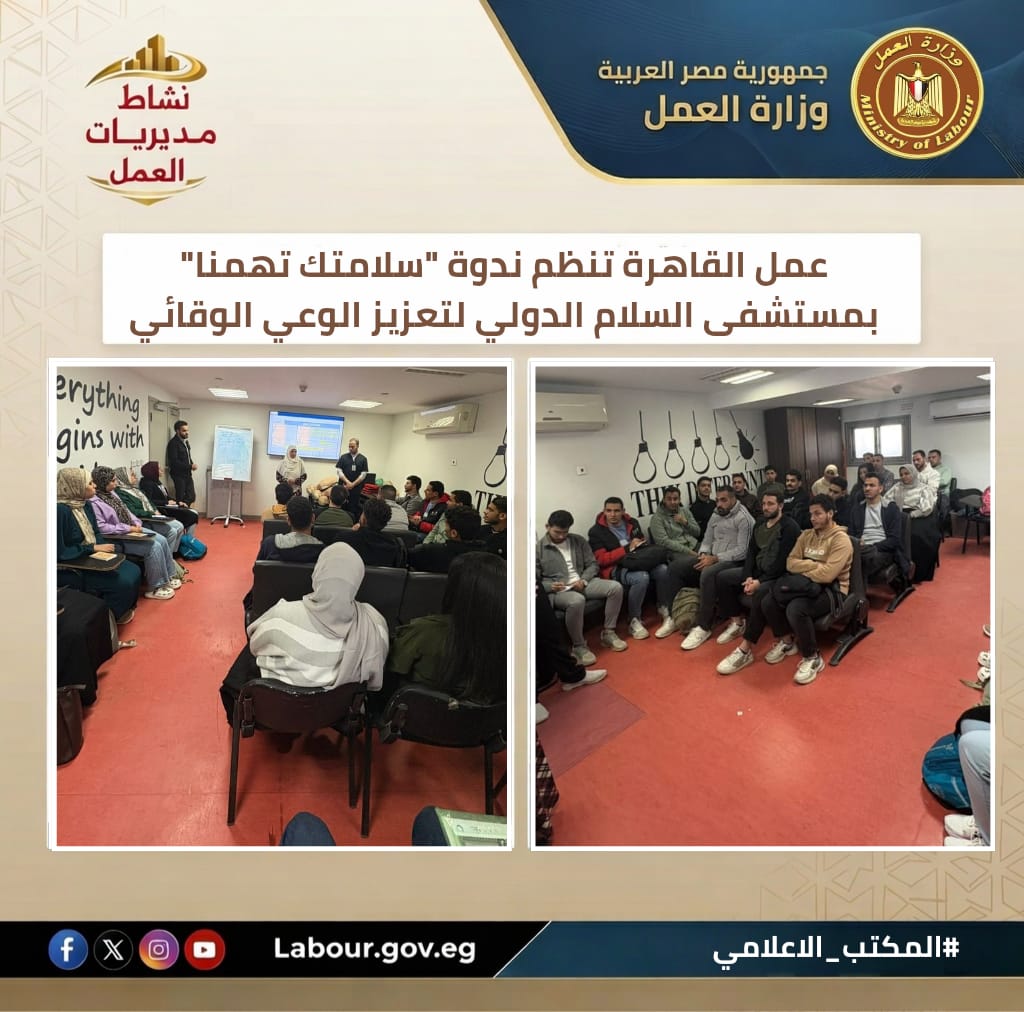 تحت رعاية وزير العمل حسن رداد، نظم مكتب سلامة المعادي بالقاهرة، بقيادة السيد الشرقاوي مدير المديرية، ندوة تثقيفية بمستشفى السلام الدولي. وتناولت الندوة سبل التحكم في مخاطر بيئة العمل وأهمية التدريب على خطط الطوارئ لحماية الكوادر الطبية والإدارية وضمان بيئة عمل آمنة ومستقرة.