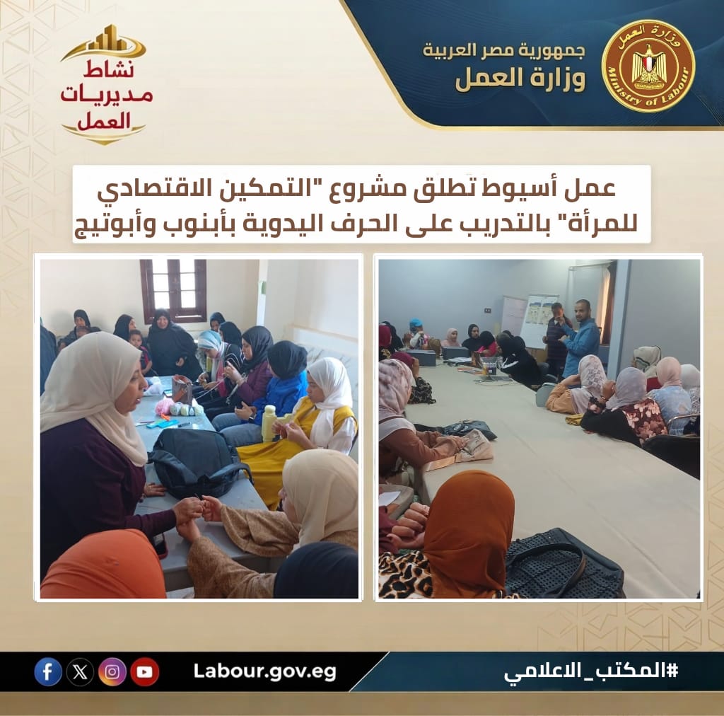 تنفيذًا لتوجيهات وزير العمل حسن رداد، بدأت مديرية عمل أسيوط، بإشراف الدكتور حازم علي حسن، تنفيذ دورات "الطباعة على الفخار والكروشيه" بأبنوب وأبوتيج. ويستهدف المشروع تمكين المرأة اقتصادياً وتنمية مهاراتها الحرفية لتأهيلها لبدء مشروعات صغيرة تساهم في رفع مستوى معيشة أسرتها.