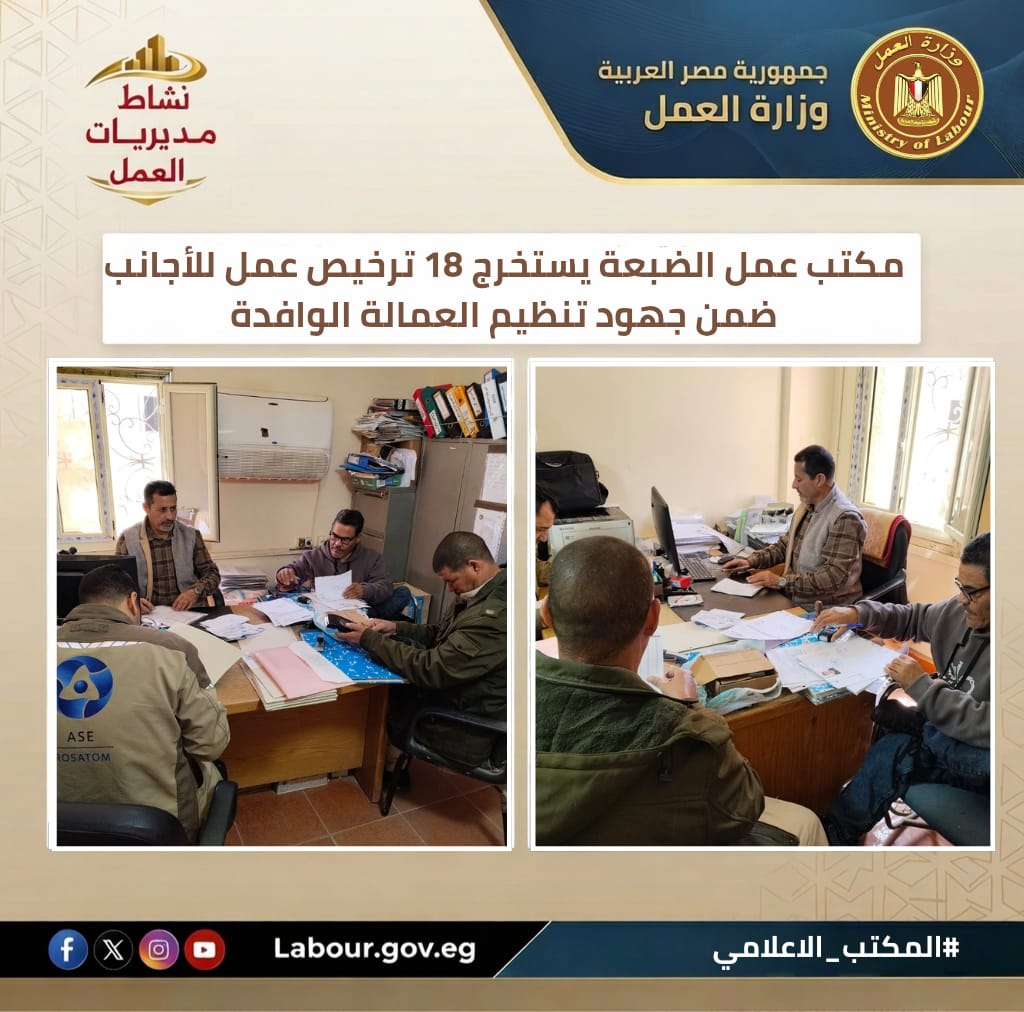 15. استخراج 18 ترخيص عمل للأجانب بمكتب عمل الضبعة بمطروح