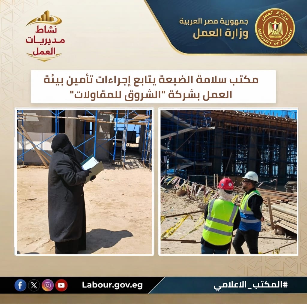 تحت رعاية وزير العمل حسن رداد، نفذ مكتب السلامة بالضبعة حملة تفتيشية على شركة "الشروق للمقاولات" بموقع ساوث ميد (طلعت مصطفى). وتستهدف الحملة التحقق من توفير مهمات الوقاية الشخصية وتدريب العاملين على الاحتياطات المهنية حمايةً للأرواح والممتلكات وضمان سير العمل بأمان.
