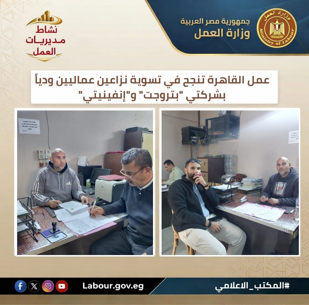 تنفيذاً لتوجيهات وزير العمل حسن رداد، نجح مكتب علاقات عمل مصر الجديدة، بقيادة السيد الشرقاوي، في إنهاء نزاعين لعامليْن دون التقاضي. وأسفرت الجهود عن عودة شاكٍ لعمله بشركة "بتروجت"، وحصول آخر على كامل مستحقاته من شركة "إنفينيتي"، تفعيلاً لدور مكاتب العمل في الحل السلمي للنزاعات.