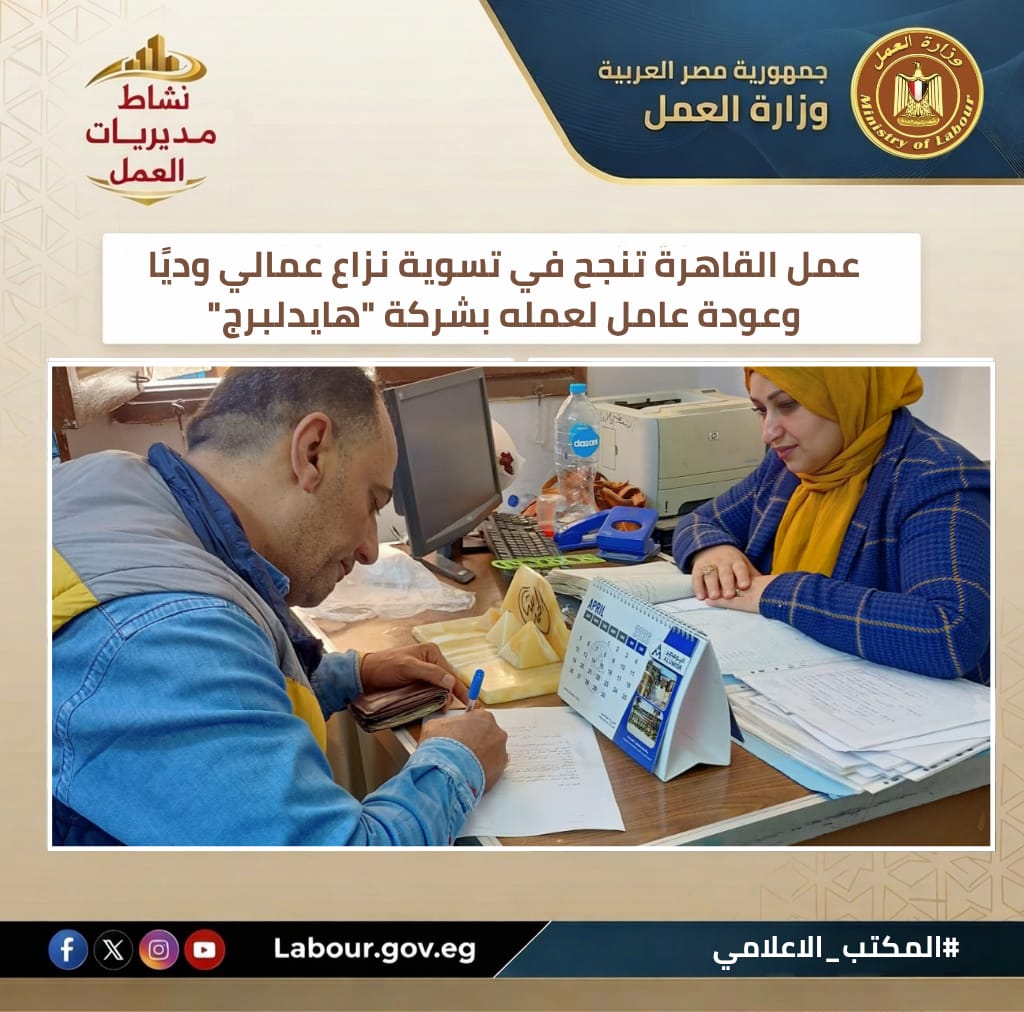 تنفيذًا لتوجيهات وزير العمل حسن رداد، نجحت مديرية عمل القاهرة، بقيادة السيد الشرقاوي، في إتمام تسوية ودية لإنهاء نزاع عمالي بمكتب حلوان. وأسفرت المفاوضات عن عودة العامل لعمله وصرف كافة مستحقاته المالية وتنازله عن الشكوى، تعزيزًا لاستقرار بيئة العمل وحل النزاعات سلميًا دون اللجوء للقضاء.