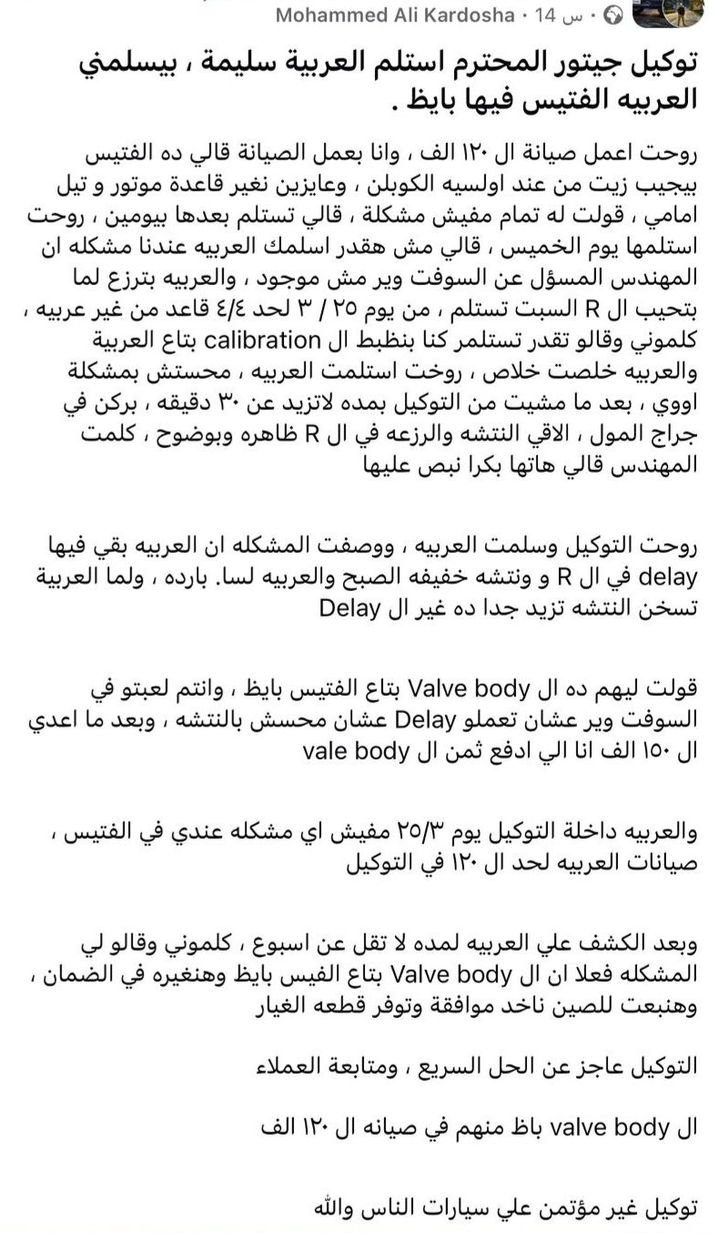 وتابع: والعربيه داخلة التوكيل يوم ٢٥/٣ مفيش اي مشكله عندي في الفتيس ، صيانات العربيه لحد ال ١٢٠ في التوكيل وبعد الكشف علي العربيه لمده لا تقل عن اسبوع ، كلموني وقالو لي المشكله فعلا ان ال Valve body بتاع الفيس بايظ وهنغيره في الضمان ، وهنبعت للصين ناخد موافقة وتوفر قطعه الغيار التوكيل عاجز عن الحل السريع ، ومتابعة العملاء توكيل غير مؤتمن علي سيارات الناس والله.