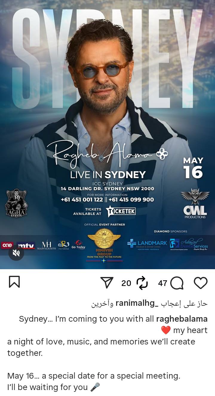 يستعد الفنان اللبناني راغب علامة للقاء جمهوره في أستراليا، حيث يحيي حفلًا غنائيًا كبيرًا بمدينة سيدني يوم 16 مايو المقبل، وذلك على مسرح مركز المؤتمرات الدولي.
