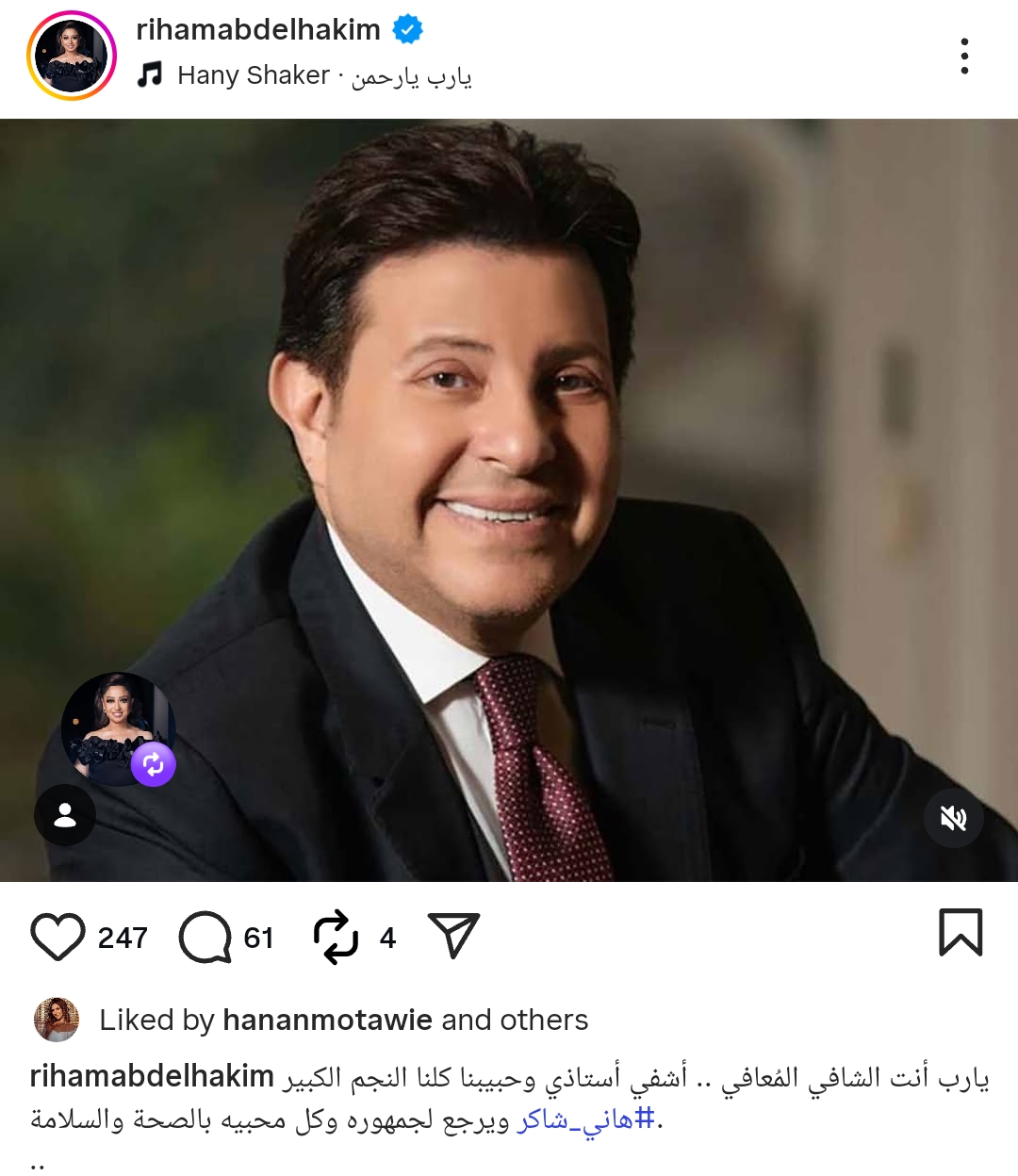 وكتبت ريهام عبد الحكيم من خلال حسابها الرسمي عبر موقع تبادل الصور والفيديوهات القصيرة إنستجرام، قالت: يارب أنت الشافي المعافي .. أشفي أستاذي وحبيبنا كلنا النجم الكبير هاني شاكر ويرجع لجمهوره وكل محبيه بالصحة والسلامة.