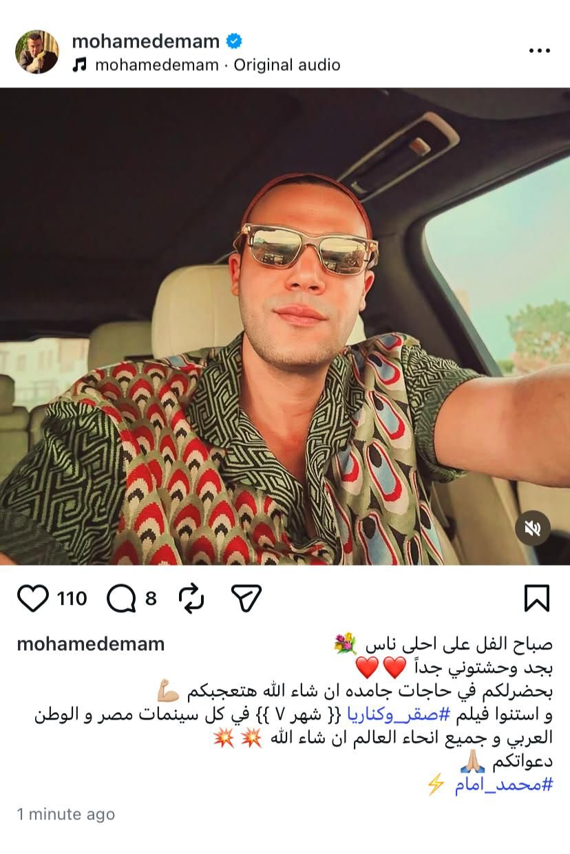 وكتب محمد إمام من خلال حسابه الرسمي عبر موقع تبادل الصور والفيديوهات القصيرة إنستجرام، قال: صباح الفل على احلى ناس بجد وحشتوني جداً.. بحضرلكم في حاجات جامده ان شاء الله هتعجبكم.