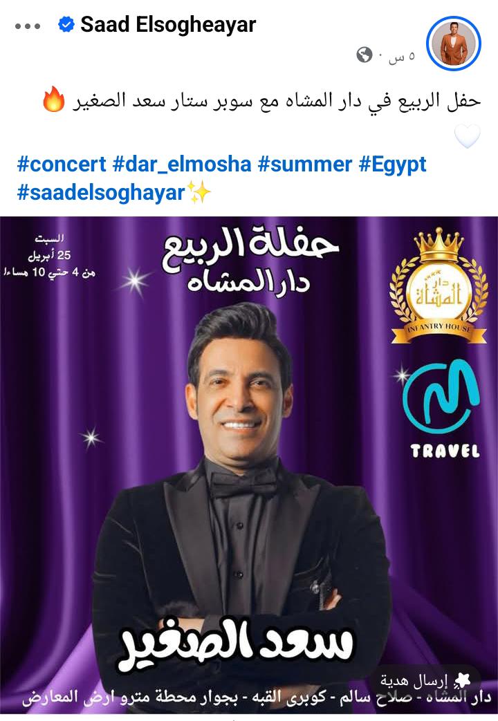 ونشر سعد الصغير عبر حسابه الرسمي على موقع «فيس بوك» بوستر الحفل، معلقًا: «حفل الربيع في دار المشاة مع سوبر ستار سعد الصغير»، في إشارة إلى الحفل المنتظر الذي يأتي ضمن سلسلة حفلات الموسم.