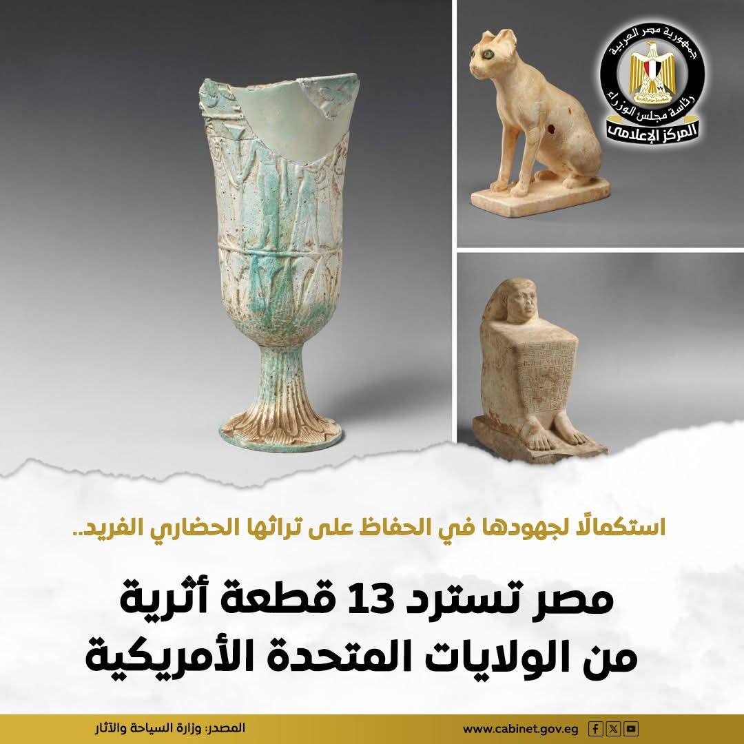 نجحت مصر في استرداد 13 قطعة أثرية من الولايات المتحدة الأمريكية، والتي كانت قد خرجت من البلاد بطرق غير مشروعة.