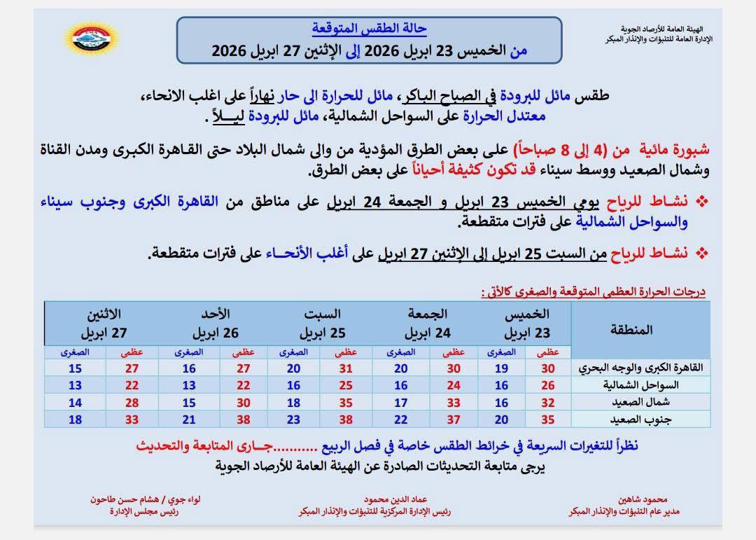 حالة الطقس غداً الخميس 23 أبريل 2026..أجواء مائلة للحرارة نهاراً وشبورة مائية صباحاً