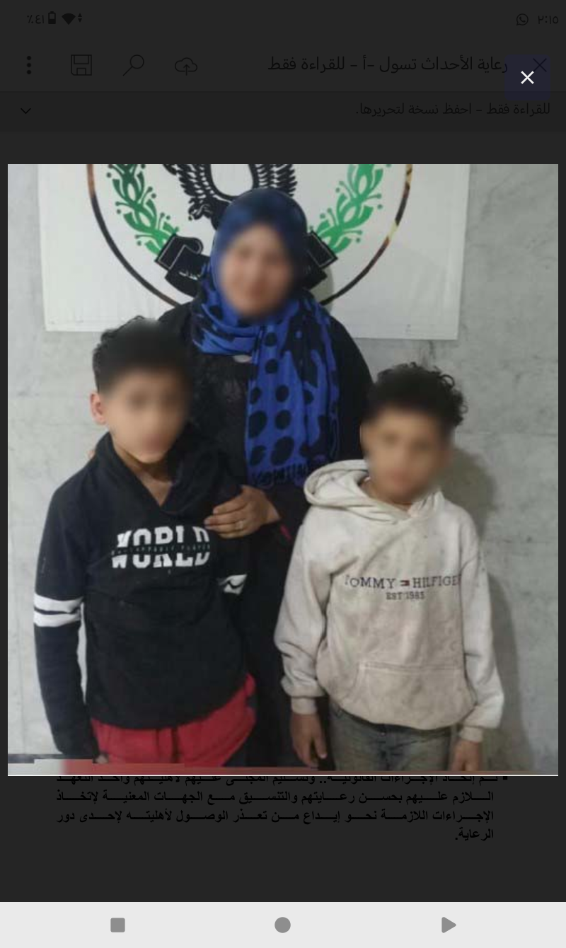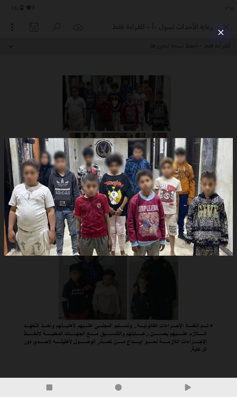 تم إتخاذ الإجراءات القانونية.. وتسليم المجنى عليهم لأهليتهم وأخذ التعهد اللازم عليهم بحسن رعايتهم والتنسيق مع الجهات المعنية لإتخاذ الإجراءات اللازمة نحو إيداع من تعذر الوصول لأهليته لإحدى دور الرعاية.