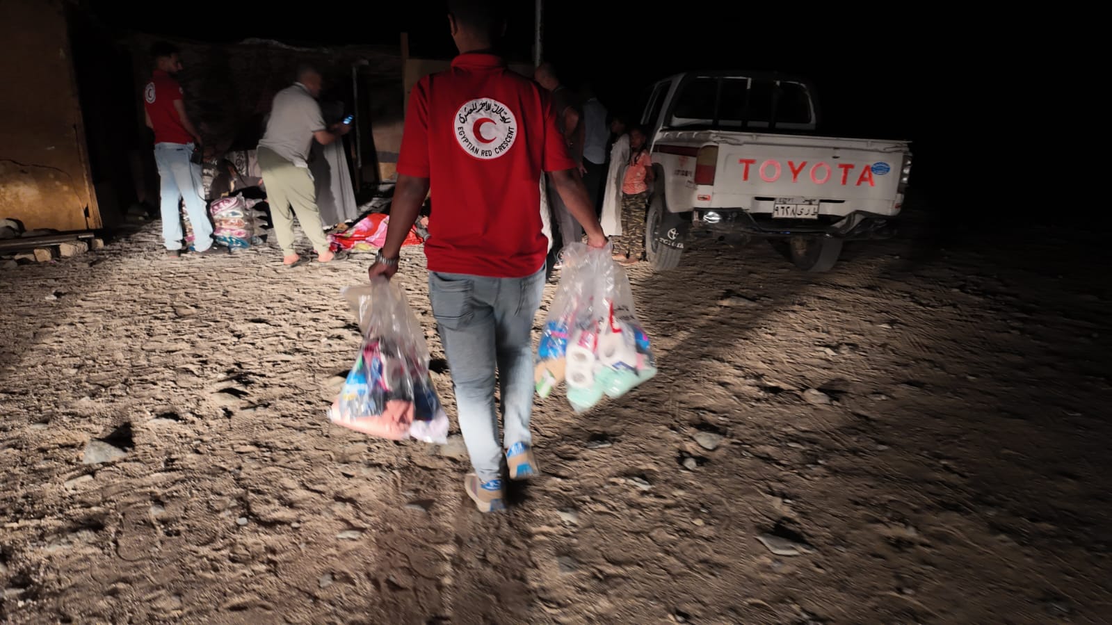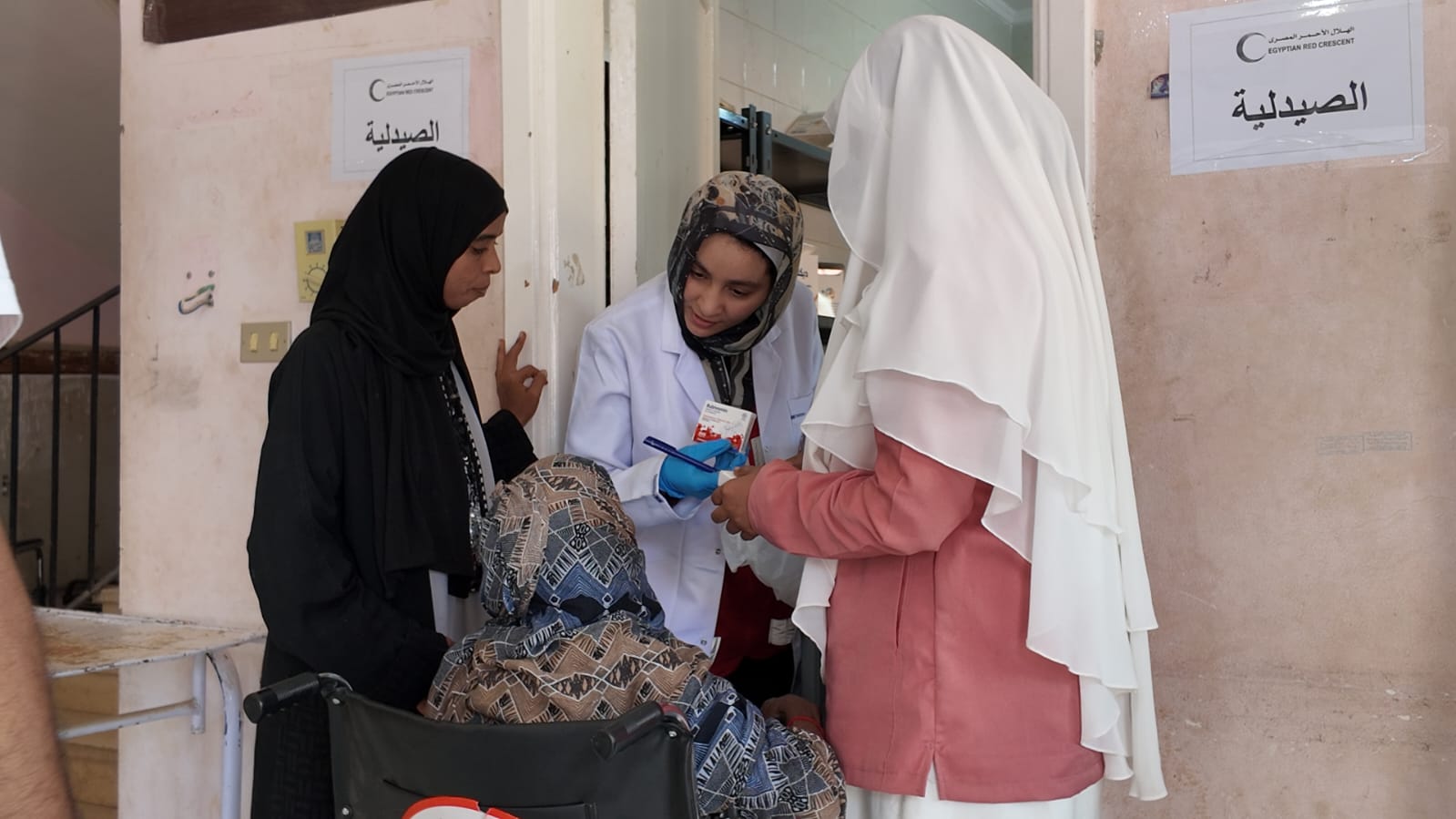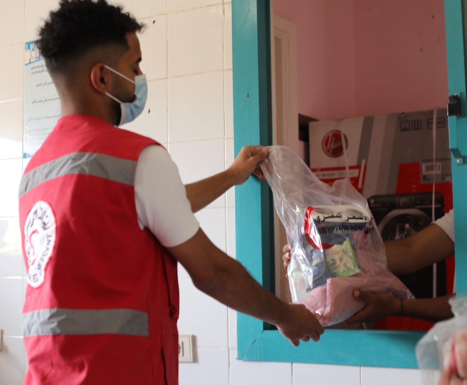 وقام متطوعو الهلال الأحمر المصري بتوزيع بطاطين، حقائب العناية الشخصية على المستفيدين، و"حقائب السعادة" على الأطفال.