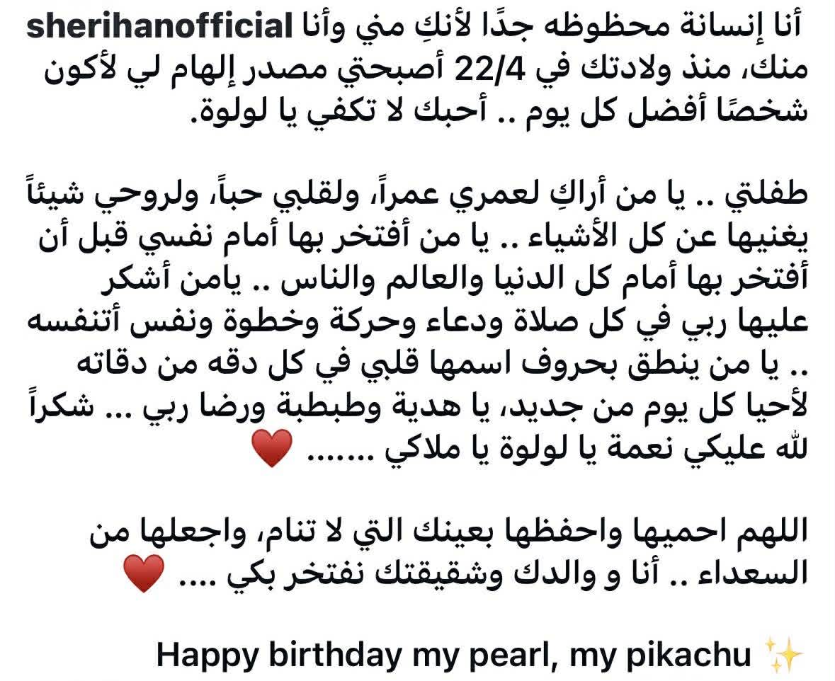 وجاء في رسالة شيريهان: “أنا إنسانة محظوظة جدًا لأنكِ مني وأنا منكِ، منذ ولادتكِ في 22/4 أصبحتِ مصدر إلهام لي لأكون شخصًا أفضل كل يوم.. أحبكِ لا تكفي يا لولوة”، معبرة عن عمق ارتباطها بابنتها وتأثيرها الكبير في حياتها اليومية.