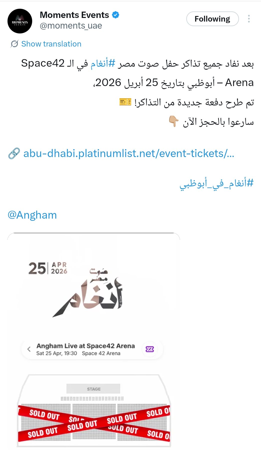 وكتبت الشركة المنظمة للحفل من خلال حسابها الرسمي عبر موقع التواصل الاجتماعي «إكس»: بعد نفاد جميع تذاكر حفل صوت مصر #أنغام في الـ Space42 Arena أبوظبي بتاريخ 25 أبريل 2026.. تم طرح دفعة جديدة من التذاكر.