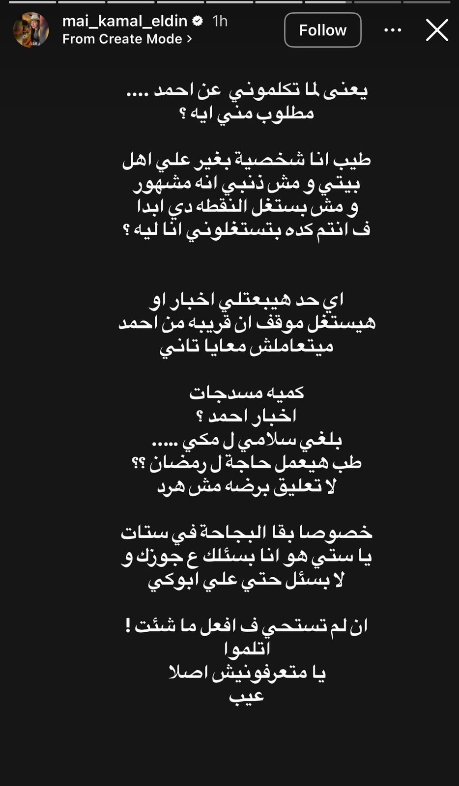 نشرت الفنانة مي كامل الدين طليقة الفنان أحمد مكي رسالة مطوّلة عبر خاصية “ستوري” على حسابها الرسمي بموقع إنستجرام، عبّرت خلالها عن استيائها من تدخل البعض في حياتها الخاصة وتداول أحاديث عنها لا ترغب في مناقشتها أو الرد عليها.