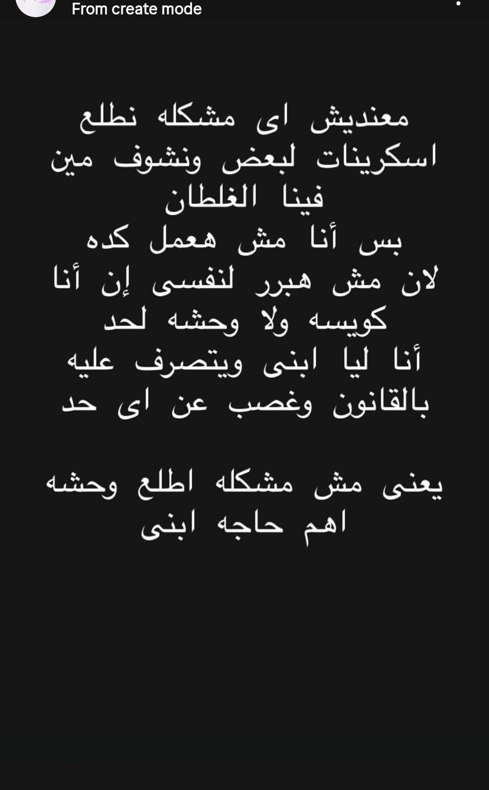 وأضافت أنها لا ترغب في تصعيد الخلاف أو الدخول في سجالات عبر مواقع التواصل الاجتماعي، موضحة: «أنا ليا ابني، وهو بيتصرف عليه بالقانون وغصب عن أي حد، ومش فارق معايا أطلع وحشة، أهم حاجة ابني».