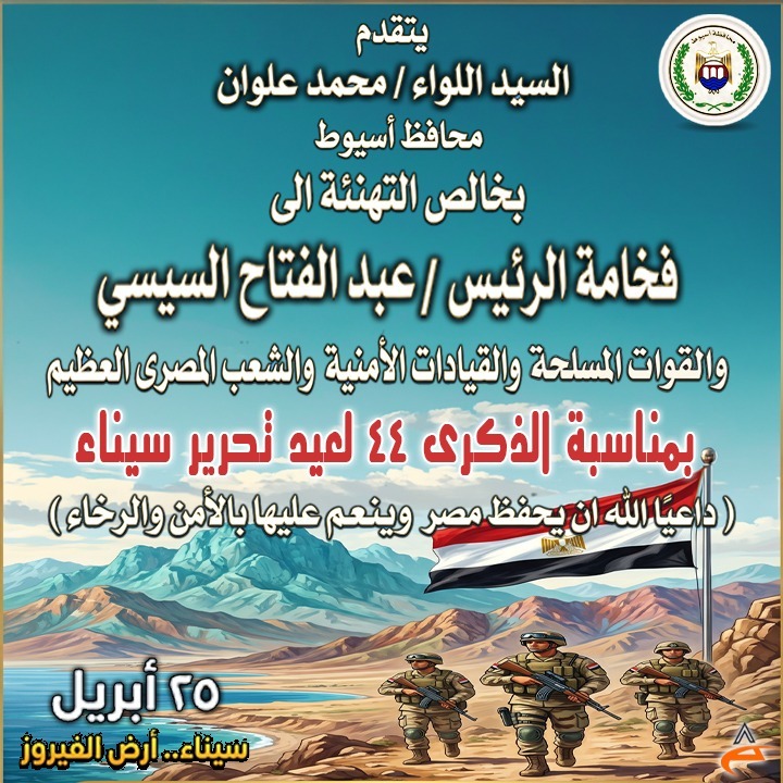 بعث اللواء محمد علوان، محافظ أسيوط، برقية تهنئة إلى فخامة الرئيس عبد الفتاح السيسي، رئيس الجمهورية والقائد الأعلى للقوات المسلحة، بمناسبة الذكرى الرابعة والأربعين لتحرير سيناء وعودتها إلى أحضان الوطن، مؤكدًا أن هذه المناسبة الوطنية الخالدة ستظل شاهدًا على بطولات وتضحيات رجال القوات المسلحة في الدفاع عن تراب الوطن.