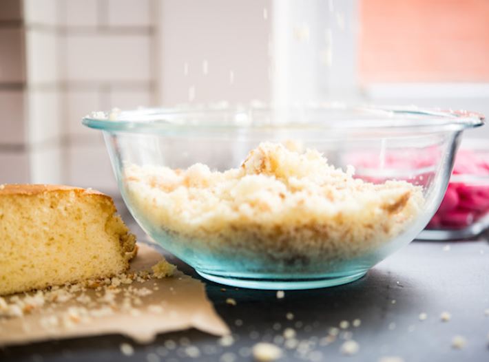 - تفرم الكيك المبلل جيدًا.