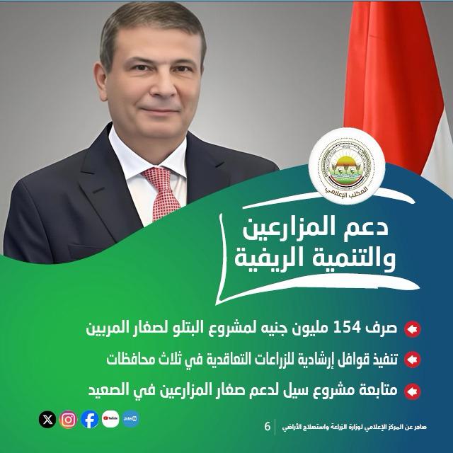 كما كثفت الوزارة جهودها في متابعة مشروعات التنمية الزراعية حيث تم تفقد مشروعات في وادي الصعايدة ووادي النقرة شملت استصلاح 5000 فدان وتطوير نظم الري والطاقة الشمسية ودعم صغار المزارعين