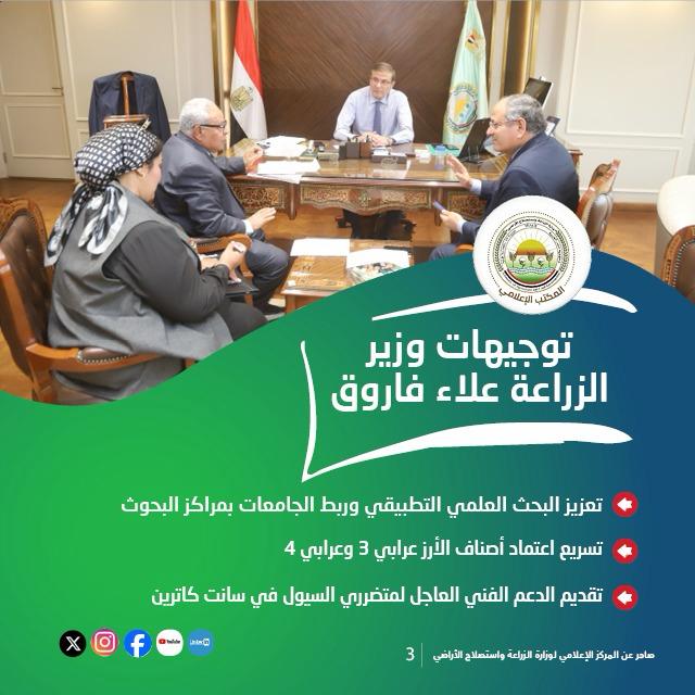 وأكد السيد علاء فاروق وزير الزراعة واستصلاح الأراضي أهمية التوسع في البحوث التطبيقية التي تخدم المزارع بشكل مباشر مع ضرورة تكاملها مع الجامعات موجها بتقييم سلالات عرابي من الأرز والقمح المقاومة للملوحة والجفاف وسرعة الانتهاء من اعتماد أصناف الأرز عرابي 3 وعرابي 4 لرفع إنتاجية المحاصيل الاستراتيجية ودعم الأمن الغذائي.