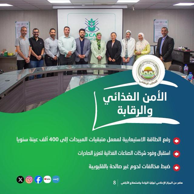 ميدانيا كثفت الوزارة جهودها الرقابية حيث نجحت في ضبط محل بالقليوبية ينتحل صفة الوزارة ويبيع لحوما غير صالحة كما واصلت حملات إزالة التعديات على الأراضي الزراعية والتي أسفرت عن إزالة 211 حالة خلال أسبوع منها 207 حالات في المهد، وفي إطار دعم الصادرات ورفع كفاءة منظومة سلامة الغذاء أعلنت الوزارة رفع القدرة الاستيعابية للمعمل المركزي لمتبقيات المبيدات إلى 400 ألف عينة سنويا بعد التعاقد على أجهزة حديثة كما استقبل المعمل وفدا من شركات الصناعات الغذائية لتعزيز التعاون.