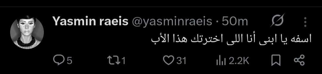 وكتبت ياسمين رئيس من خلال حسابها الرسمي عبر موقع التواصل الاجتماعي «إكس»، : “أسفة يا ابني أنا اللي اخترتلك هذا الأب”.