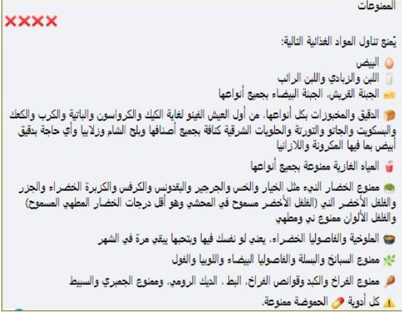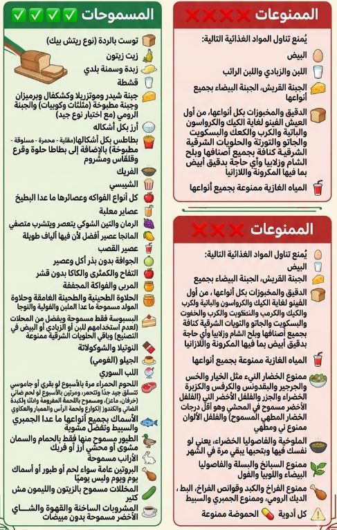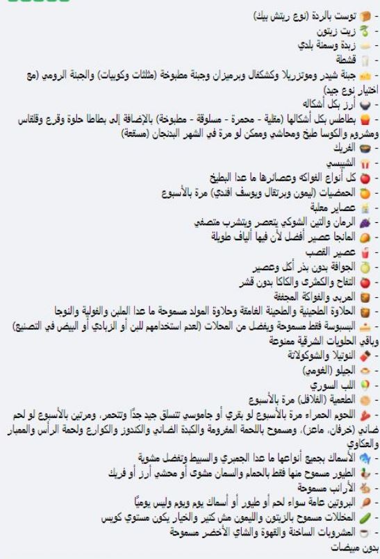البيض والألبان الممنوعة البيض بكل أشكاله. اللبن البقري والجاموسي. الزبادي واللبن الرائب واللبنة. الكريمة اللباني والكريم شانتيه. الجبنة القريش والجبنة البيضاء بجميع أنواعها وبدائل اللبن النباتية مثل لبن اللوز ولبن جوز الهند. المشروبات الممنوعة المياه الغازية البيبسي العادي والدايت وما شابهه مشروبات الطاقة مشروبات الشعير. النسكافيه والبن المغشوش