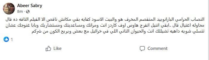 وعبّرت عبير صبري عن غضبها الشديد من خلال منشور عبر حسابها الرسمي على موقع "فيس بوك"، هاجمت فيه ترامب والبيت الأبيض بكلمات حادة، حيث كتبت: "النصاب الحرامي البارانوييد المنفصم المخرف هو والبيت الأبيض.. كفاية بقى، مكانش ناقص إلا الفيلم التافه ده.. قال محاولة اغتيال قال".