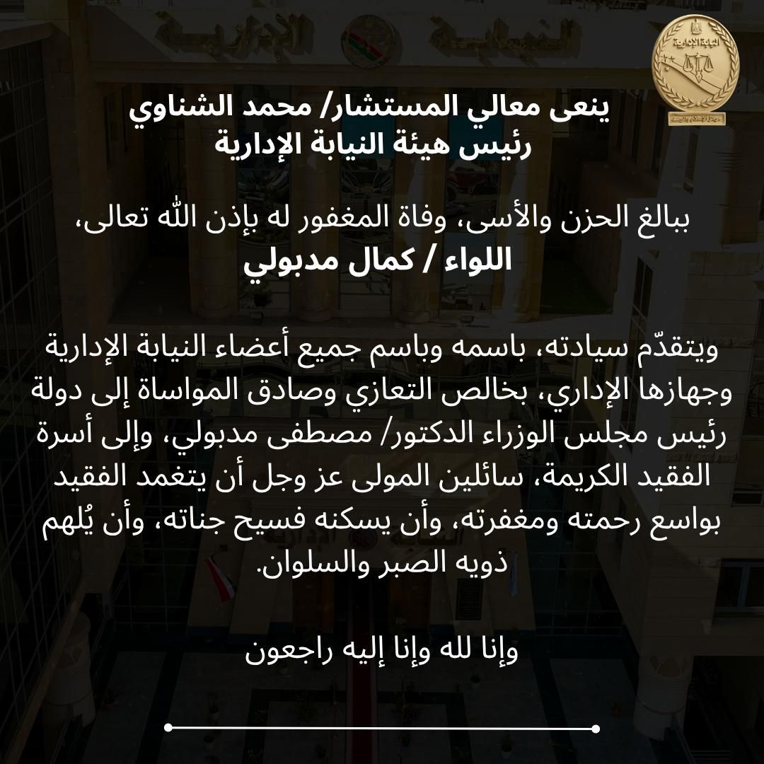 نعى المستشار محمد الشناوي - رئيس هيئة النيابة الإدارية، ببالغ الحزن والأسى، المغفور له بإذن الله تعالى، اللواء كمال مدبولي.