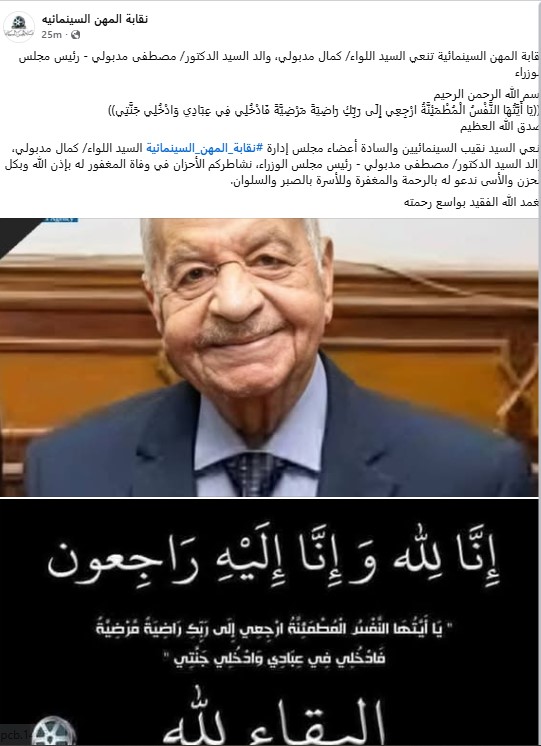 وكتبت الصفحة الرسمية لـ نقابة المهن السينمائية من خلال موقع التواصل الاجتماعي فيسبوك: نقابة المهن السينمائية تنعي السيد اللواء/ كمال مدبولي، والد السيد الدكتور/ مصطفى مدبولي - رئيس مجلس الوزراء، بسم الله الرحمن الرحيم ((يَا أَيَّتُهَا النَّفْسُ الْمُطْمَئِنَّةُ ارْجِعِي إِلَى رَبِّكِ رَاضِيَةً مَرْضِيَّةً فَادْخُلِي فِي عِبَادِي وَادْخُلِي جَنَّتِي)) صدق الله العظيم.