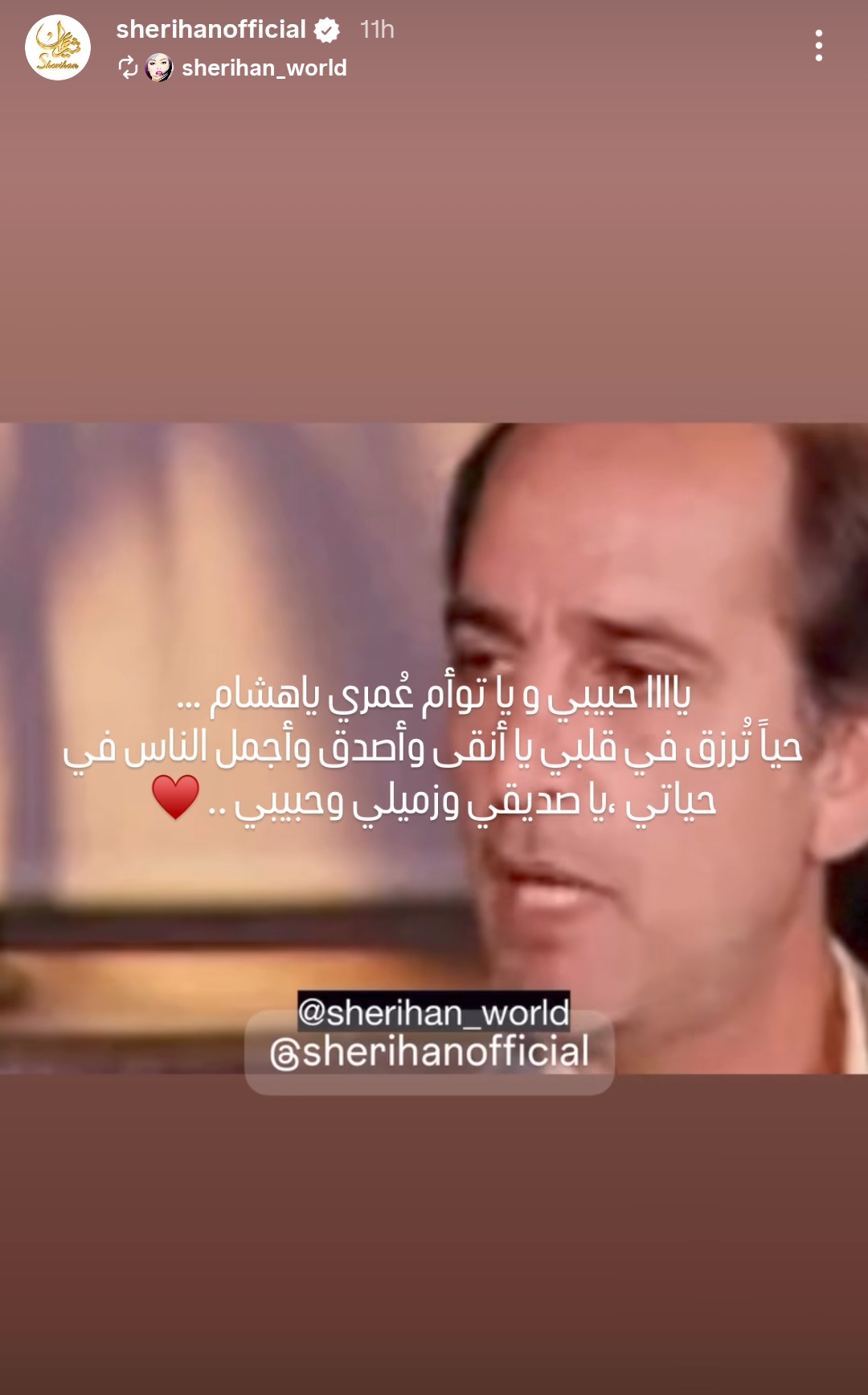 وأعادت شريهان نشر مقطع فيديو لـ هشام سليم من خلال حسابها الرسمي عبر موقع تبادل الصور والفيديوهات القصيرة إنستجرام، عبر خاصية ستوري، وكتبت: يا حبيبي ويا تؤام عمري يا هشام.. حيًا تُرزق في قلبي يا أنقى وأصدق وأجمل الناس في حياتي.. يا صديقي وزميلي وحبيبي.