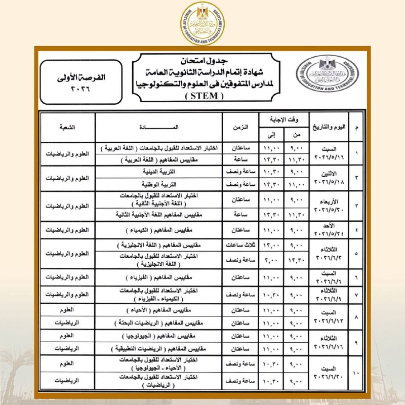 كما أعلنت الوزارة جدول امتحانات مدارس المتفوقين STEM، والتي تبدأ باختبارات الاستعداد للقبول بالجامعات ومقاييس المفاهيم خلال مايو ويونيو، وتستمر حتى يوليو 2026، وتشمل اختبارات اللغة العربية، واللغة الإنجليزية، والكيمياء، والفيزياء، والأحياء، والرياضيات، والجيولوجيا، إضافة إلى التربية الدينية والوطنية.
