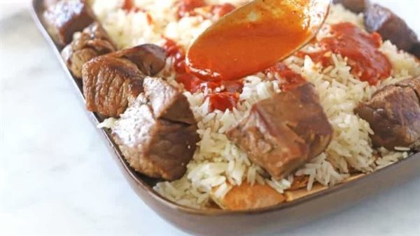 5. رتبي الخبز المقطع في أسفل صينية التقديم وقلّبيه بكمية قليلة من الصلصة أضيفي كمية من شوربة اللحم وتمتصها الخبز، ثم افردي الأرز الناضج فوقه ورشي قليلًا من الفلفل الأسود على الوجه بعد ذلك، أضيفي ما تبقى من الصلصة على السطح وضعي قطع اللحم المسلوقة على الوجه وقدميها ساخنة واستمتعي بوجبة لذيذة!