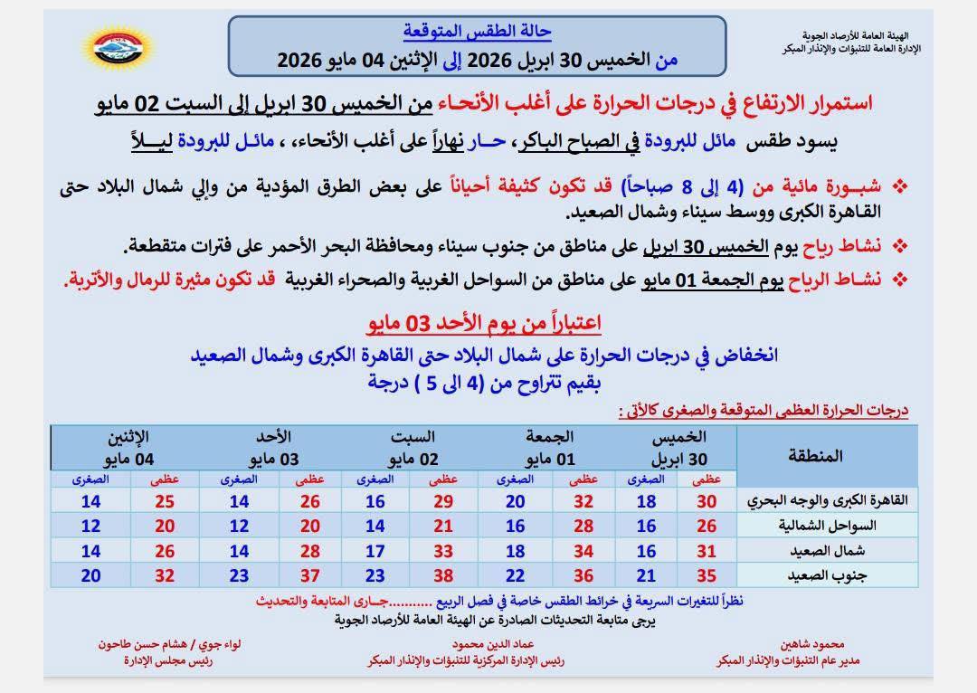 حالة الطقس غداً الخميس 30 أبريل 2026.. تشهد توقعات حالة الطقس خلال الأيام المقبلة تغيرات ملحوظة في درجات الحرارة على مختلف أنحاء الجمهورية، حيث أعلنت الهيئة العامة للأرصاد الجوية استمرار الارتفاع التدريجي في درجات الحرارة بدءًا من غدٍ الخميس 30 أبريل 2026 وحتى يوم السبت 2 مايو، قبل أن تعاود درجات الحرارة الانخفاض مرة أخرى اعتبارًا من يوم الأحد 3 مايو، مع ظهور عدد من الظواهر الجوية المؤثرة على بعض المناطق.