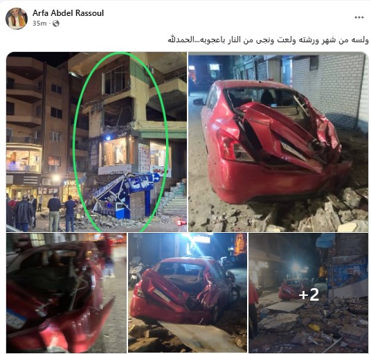 وأضاف المنشور: "كما أسفر الحادث عن تهشم سيارة حسن مصطفى درويش، نجل المخرج الراحل مصطفى درويش والنجمة عارفة عبد الرسول، وذلك أثناء انتظاره لنجله في تلك اللحظة. يُذكر أن المبنى قد صدر له قرار ترميم منذ فترة ولم يتم تنفيذه، وتم تحرير محضر بالواقعة".