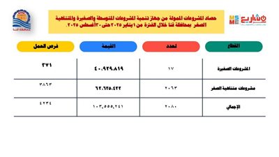 أعلن المهندس محمود العماري، رئيس فرع جهاز تنمية المشروعات الصغيرة ومتناهية الصغر بمحافظة قنا، أن الجهاز مول خلال الفترة من يناير وحتى نهاية أغسطس من العام الحالي 2080 مشروعًا صغيرًا